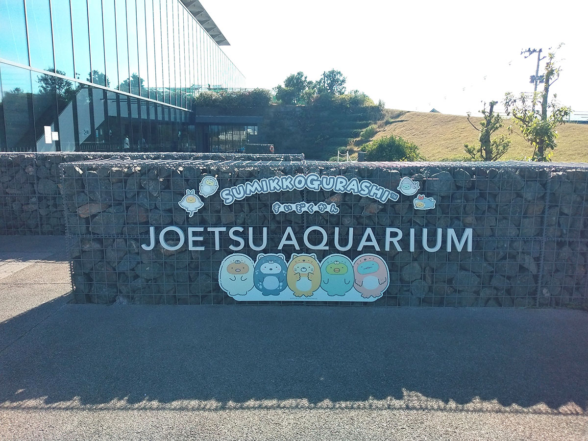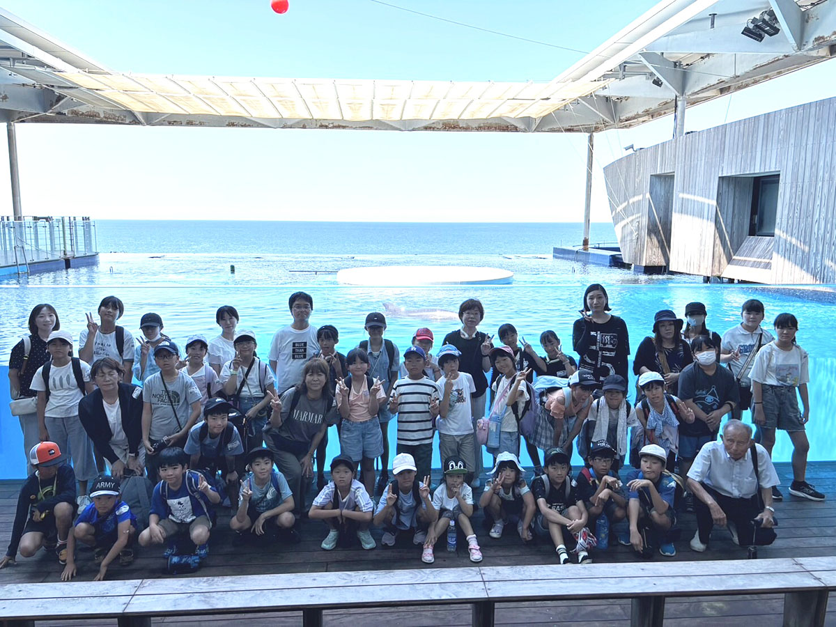 後ろの中央位置に写り込むイルカと綺麗な日本海を背景に集合写真を撮影後、すみっコぐらしのスタンプラリーをしつつ、多種多様な生き物と出会える自由散策を目いっぱい楽しみました。
